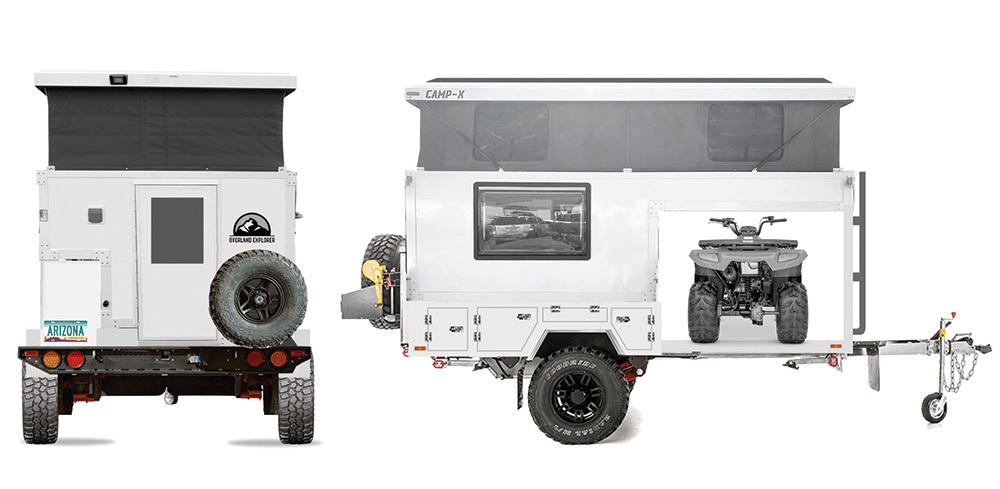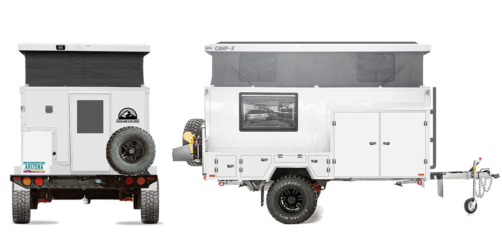 - High-clearance vehicle towing an off-road overland trailer (mounted with a rooftop tent or enclosed sleeping arrangement such as a teardrop)