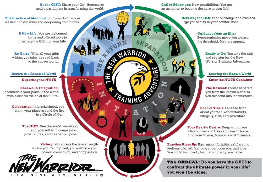 As a member of the Mankind Project [MKP] I participated in a weekend event called The New Warrior Training Adventure. The course required a complete submersion in nature. In those few days, I witnessed countless eye-opening transformations. Men of all walks of life, in all age ranges–from 18 to 83–were beside me in the course. Everyone, including the seemingly toughest hard-edged men in the course, became completely vulnerable and open and disclosed some of the deepest secrets of their lives–things that were buried deep came to the surface and were released. It was remarkable.