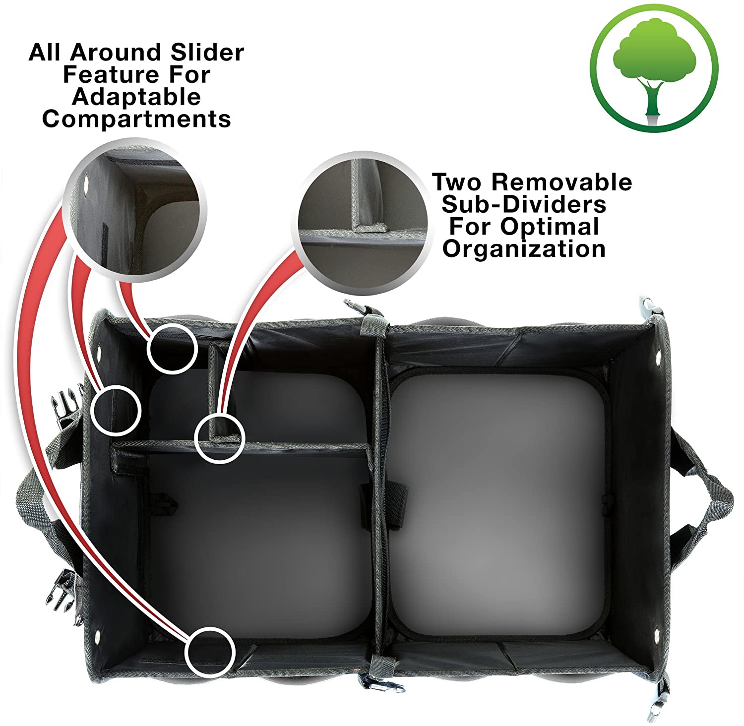 - All-In One gray Auto Trunk Organizer allowing for as many as 4 compartments which includes 2 removable sub-dividers for customization