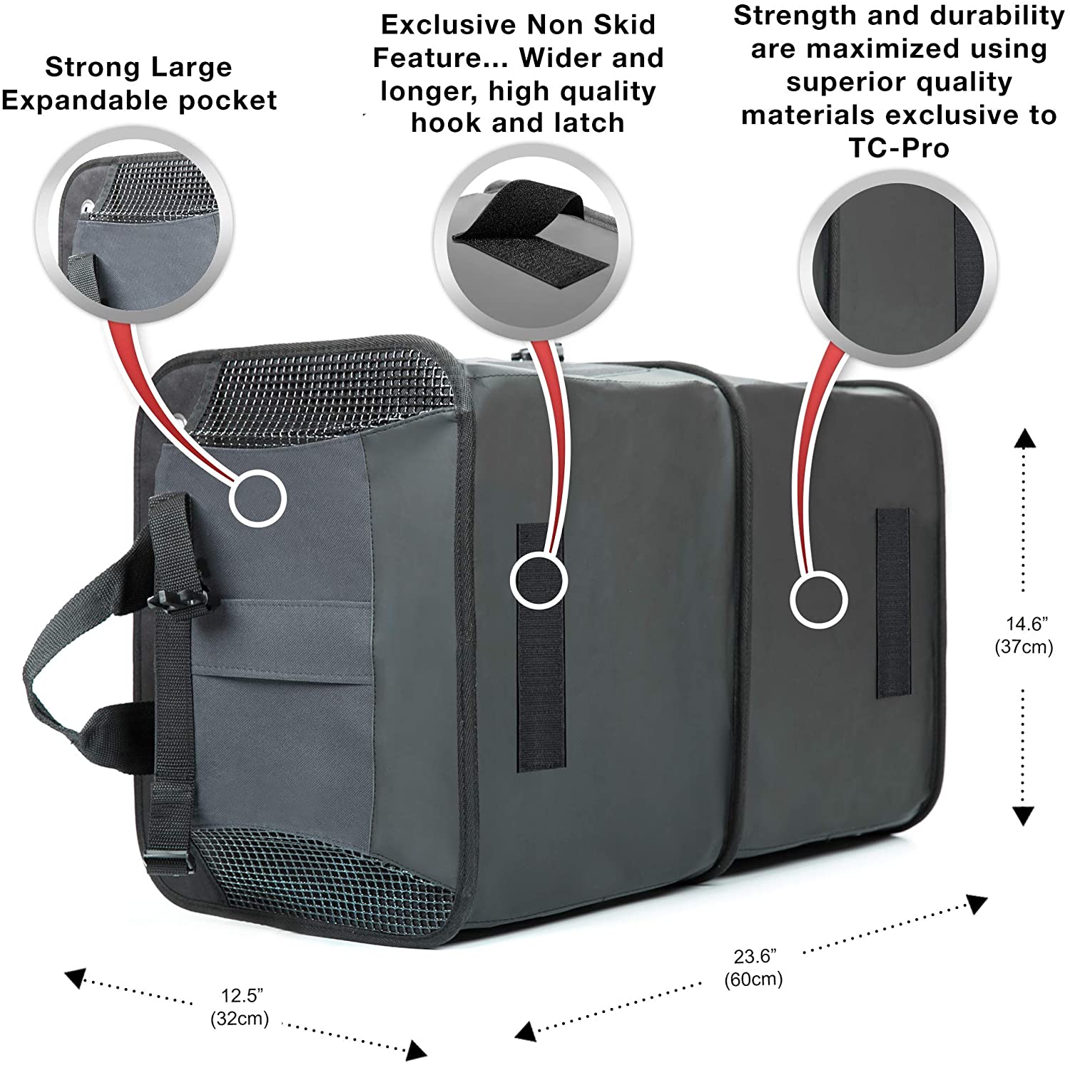 - When open, the size is 23.5″ (60 cm)*15″ (37 cm)*12 inches (12.5 cm). It is the ideal solution for all your supplies – One of the Largest, strongest and durable auto trunk organizers on the market with the customization of being able to fold in half for various job sizes